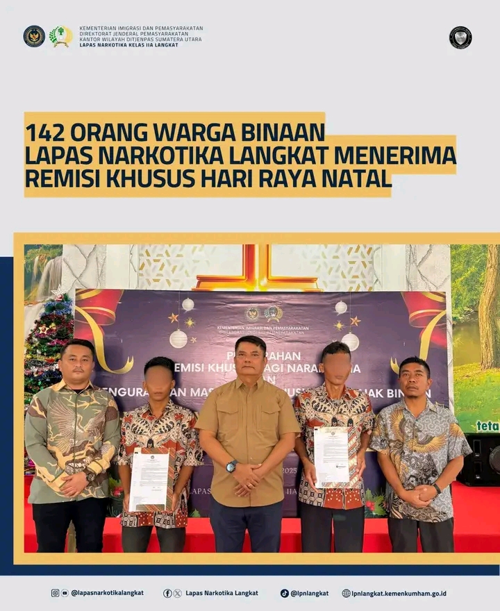 Sukacita menyelimuti perayaan Hari Natal 2025 di Lembaga Pemasyarakatan (Lapas) Narkotika Kelas IIA Langkat, sebanyak 142 orang Warga Binaan Nasrani menerima Remisi Khusus (RK) Natal. Kamis, (25/12/2025) Pemberian remisi tersebut ditandai dengan penyerahan Surat Keputusan secara langsung oleh Kepala Lapas (Kalapas) Narkotika Langkat, Tapianus Antonio Barus kepada Warga Binaan, didampingi Kasi Binadik, Horas Siregar, Kasubsi Registrasi, Bobby Sembiring. Kegiatan berlangsung dengan khidmat dan tertib, yang juga dihadiri oleh jajaran Pegawai.