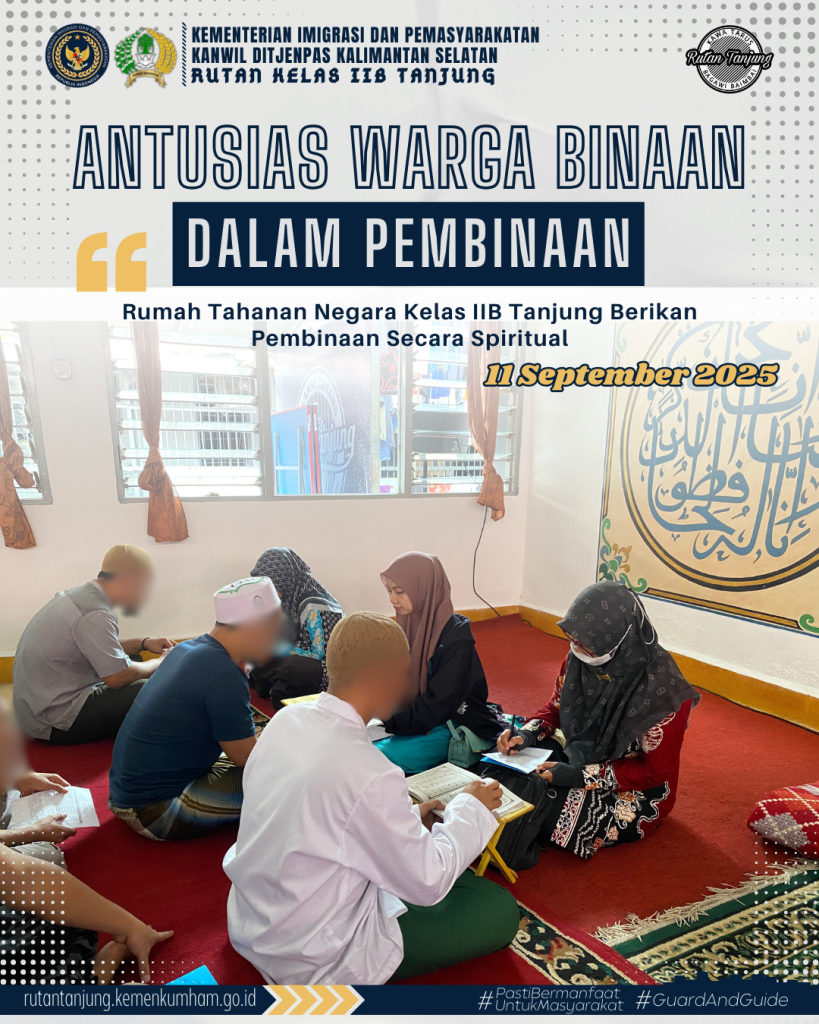 Kegiatan belajar membaca Al-Qur’an di Rumah Tahanan Negara (Rutan) Kelas IIB Tanjung merupakan bagian dari upaya pembinaan kepribadian dan peningkatan kualitas spiritual warga binaan. Program ini dilaksanakan secara rutin setiap hari kamis dengan dukungan dari Tim Penyuluh Keagamaan Kantor Keagamaan (Kemenag) Kabupaten Tabalong. Kamis (11/09/2025).