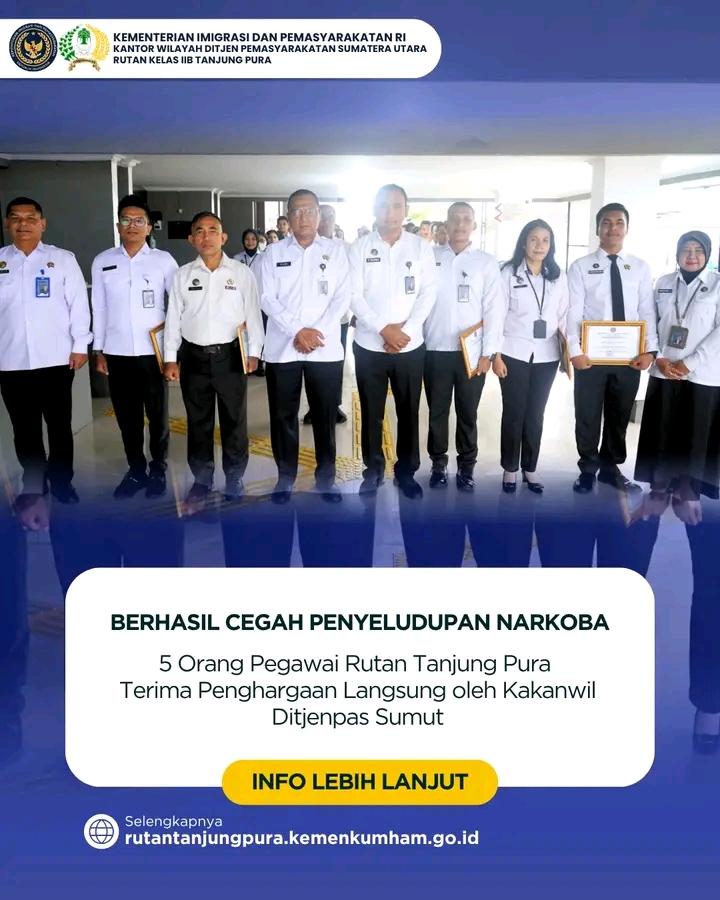 Kantor Wilayah Direktorat Jenderal Pemasyarakatan Sumatera Utara berikan penghargaan kepada 5 orang pegawai Rumah Tahanan Negara Kelas IIB Tanjung Pura atas usaha penggagalan penyeludupan narkoba jenis ganja. Senin (20/10)