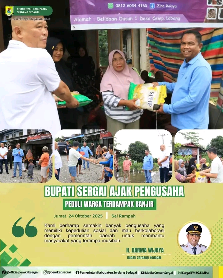 Bupati Serdang Bedagai (Sergai) H. Darma Wijaya bersama sejumlah pengusaha lokal menyalurkan bantuan kepada masyarakat yang terdampak banjir di Kecamatan Sei Rampah, Jumat (24/10/2025).