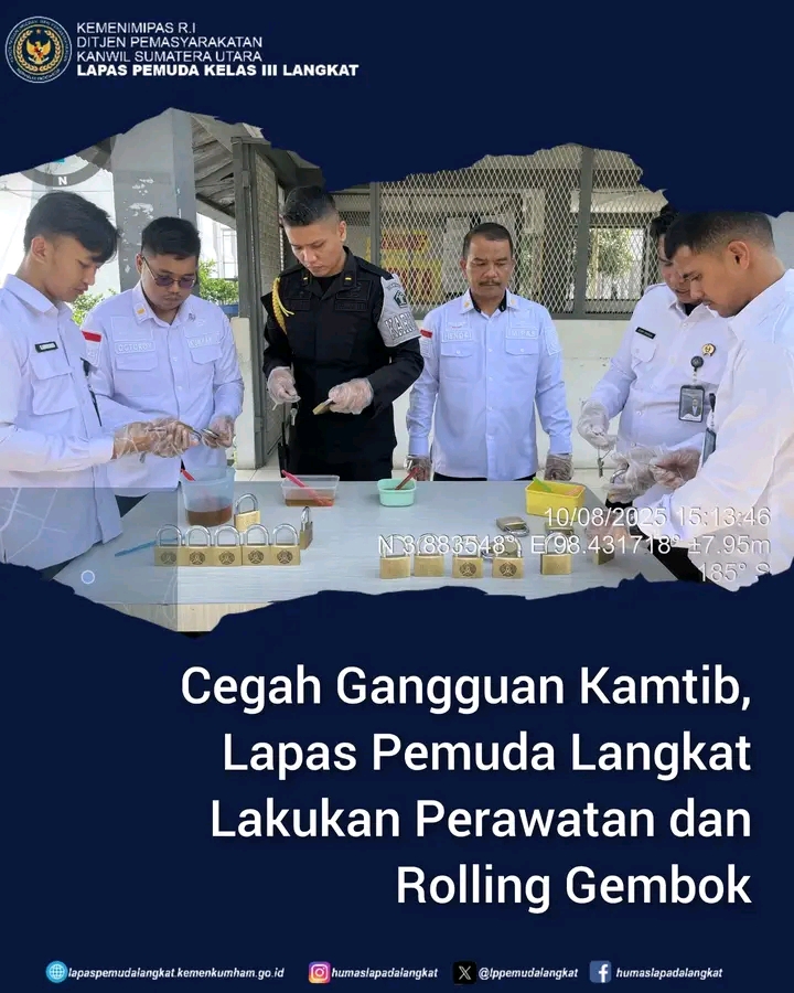 Lembaga Pemasyarakatan Pemuda Kelas III Langkat terus berkomitmen dalam menjaga keamanan dan ketertiban di lingkungan lapas. Salah satu langkah yang dilakukan adalah perawatan serta rolling gembok kamar hunian warga binaan. Kegiatan ini bertujuan untuk memastikan sistem keamanan tetap optimal dan mencegah potensi gangguan keamanan akibat kelalaian atau kerusakan pada sarana pengamanan, Rabu (08/10/2025).
