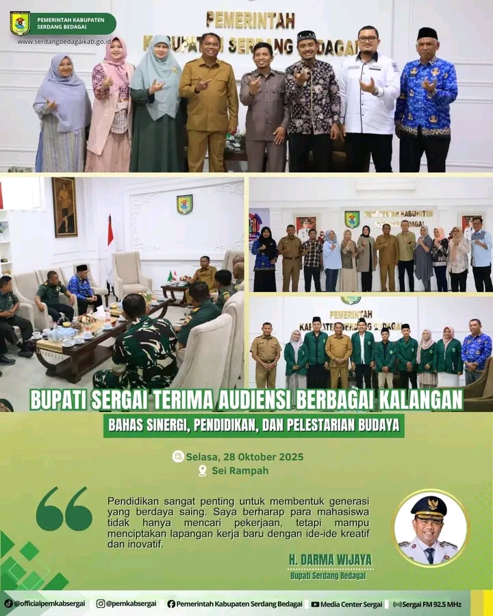 Bupati Serdang Bedagai (Sergai) H. Darma Wijaya menerima audiensi dari berbagai kelompok masyarakat untuk mendengar aspirasi masyarakat dan pemangku kepentingan secara langsung di Kantor Bupati Sergai, Sei Rampah, Selasa (28/10/2025).