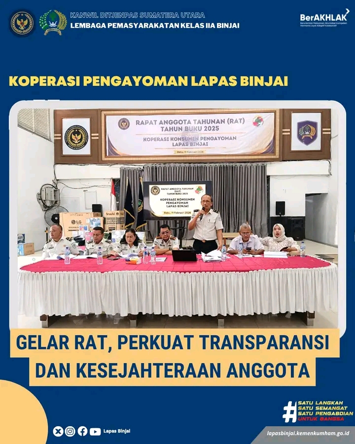 Binjai, INFO_PAS – Koperasi Pengayoman Lembaga Pemasyarakatan (Lapas) Kelas IIA Binjai menggelar Rapat Anggota Tahunan (RAT) sebagai bentuk pertanggungjawaban pengurus sekaligus evaluasi kinerja koperasi selama satu tahun buku, bertempat di aula Lapas Binjai, Rabu, 11 Februari 2026.