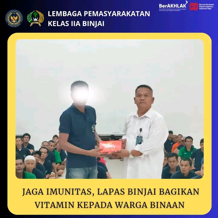Lembaga Pemasyarakatan (Lapas) Kelas IIA Binjai, melakukan pembagian vitamin kepada warga binaan. Pembagian Ini dibagikan langsung oleh Kasi Binadik, Andi Gultom, bersama dengan Kasubsi Bimkemaswat, Dion Sitorus beserta petugas klinik Lapas kelas IIA Binjai, Selasa (14/10/2025).