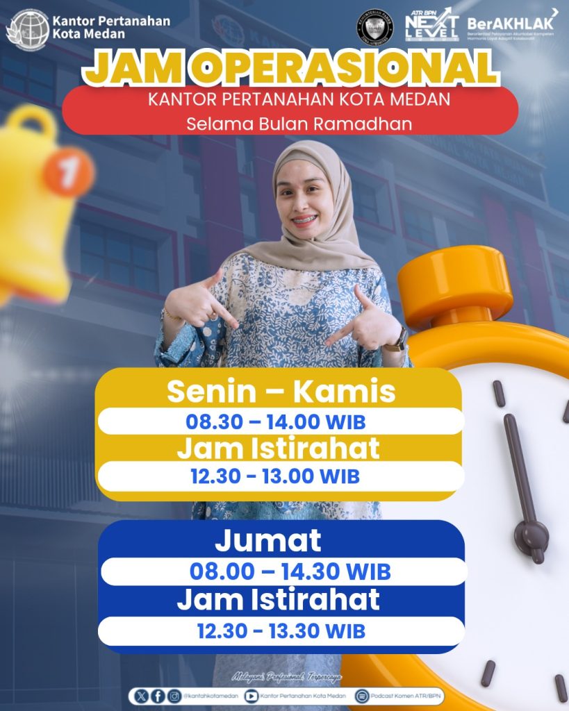 Medan, HARIANMEDIARAKYAT – Pada bulan suci Ramadan 1447 Hijriah, Kantor Pertanahan Kota Medan melakukan penyesuaian jam layanan kepada masyarakat. Kebijakan ini diberlakukan selama bulan Ramadan sebagai bentuk penyesuaian waktu kerja pegawai sekaligus memastikan pelayanan publik tetap berjalan optimal. Informasi ini disampaikan secara resmi agar masyarakat dapat menyesuaikan waktu kunjungan dan tetap mendapatkan layanan pertanahan secara tertib dan nyaman.