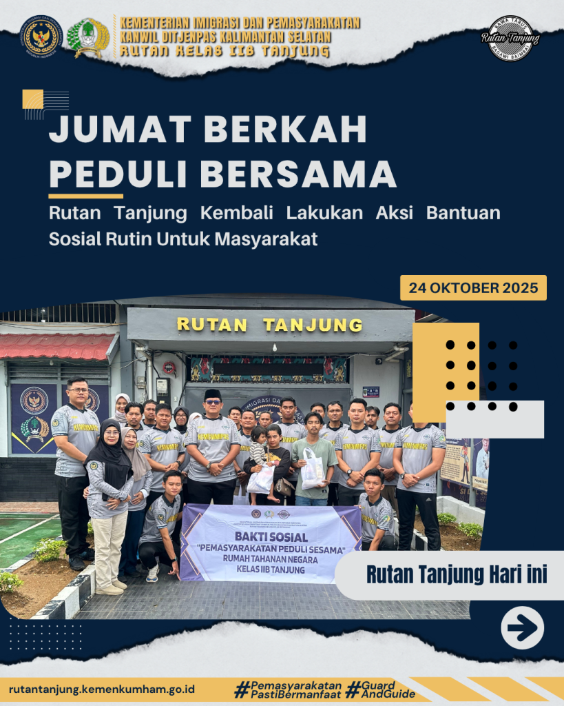 Rumah Tahanan Negara (Rutan) Kelas IIB Tanjung kembali menggelar kegiatan Bakti Sosial Jumat Berkah yang dipimpin langsung oleh Kepala Rutan Kelas IIB Tanjung, Raymon Andika Girsang beserta Pejabat Struktural dan seluruh pegawai Rutan Tanjung di sekitaran jalan raya dan lingkungan Rutan Tanjung. Jum’at (24/10/2025).