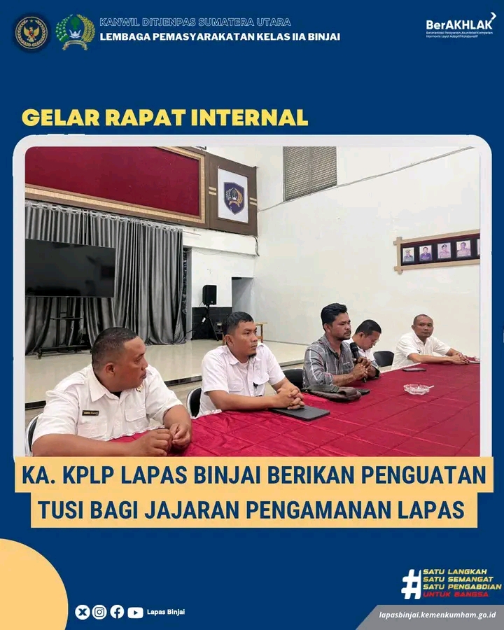 Kepala Kesatuan Pengamanan Lembaga Pemasyarakatan (Ka.KPLP) Lapas Kelas IIA Binjai, Rudi Icuana Sembiring, bersama Kasi Adm & Kamtib, Serikat Sembiring, Kasubsi Keamanan, Samuel Silalahi, Kasubsi Pelaporan, Abdurrahman Sirait, JFT Keamanan, Harry Wibowo, memimpin rapat internal jajaran pengaman Lapas Binjai bertempat di Aula Lapas. Rapat tersebut bertujuan untuk memberikan penguatan tugas dan fungsi (tusi) serta meningkatkan semangat kerja terkhususnya di jajaran Keamanan. Rabu, (24/12/2025).