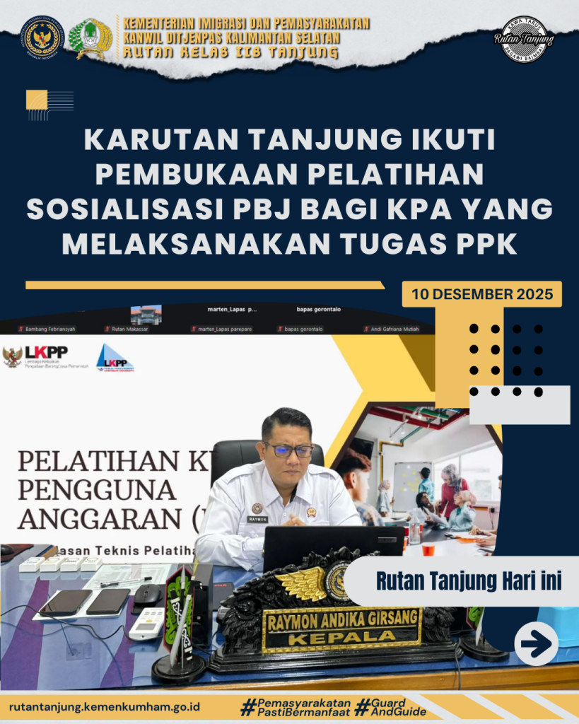 Kepala Rumah Tahanan Negara (Rutan) Kelas IIB Tanjung, Raymon Andika Girsang, mengikuti kegiatan Sosialisasi Pengetahuan tentang Pengadaan Barang/Jasa (PBJ) bagi Kuasa Pengguna Anggaran (KPA) yang melaksanakan tugas Pejabat Pembuat Komitmen (PPK) melalui Metode Massive Open Online Course (MOOC) di Lingkungan Kementerian Imigrasi dan Pemasyarakatan. Rabu (10/12/2025).