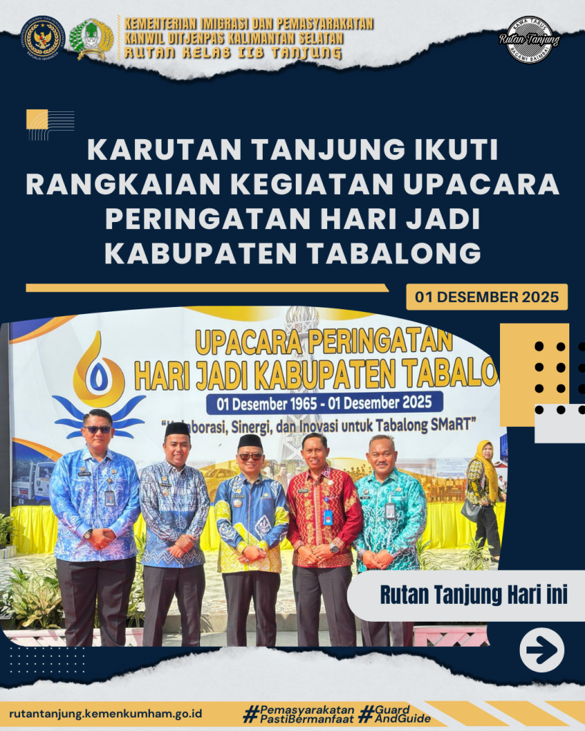 Kepala Rumah Tahanan Negara (Rutan) Kelas IIB Tanjung, Raymon Andika Girsang, mengikuti kegiatan upacara peringatan Hari Jadi Kabupaten Tabalong ke-60 tahun 2025 dengan penuh khidmat sebagai wujud sinergi dengan pemerintah daerah. Senin (01/12/2025).