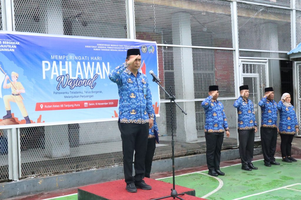 Tanjung Pura, HARIANMEDIARAKYAT – Rumah Tahanan Negara (Rutan) Kelas IIB Tanjung Pura melaksanakan Upacara Peringatan Hari Pahlawan di Lapangan Utama Rutan, Senin (10/11). Upacara dipimpin langsung oleh Kepala Rutan Tanjung Pura, Fransisco Pandia, dan diikuti oleh seluruh pegawai serta warga binaan pemasyarakatan.