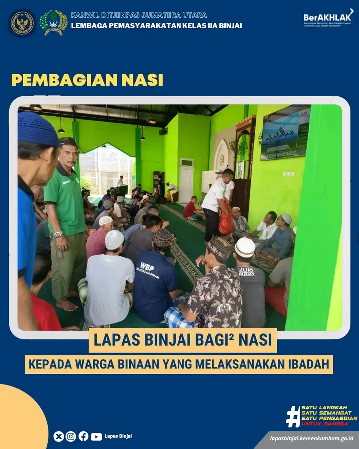 Lembaga Pemasyarakatan Kelas IIa Binjai melaksanakan pembagian Nasi kepada Warga Binaan yang beribadah di masjid Lapas. Bakti sosial ini bertujuan agar silaturahmi antar petugas dan warga binaan menjadi harmonis serta menimbulkan rasa peduli antar sesama masyarakat.