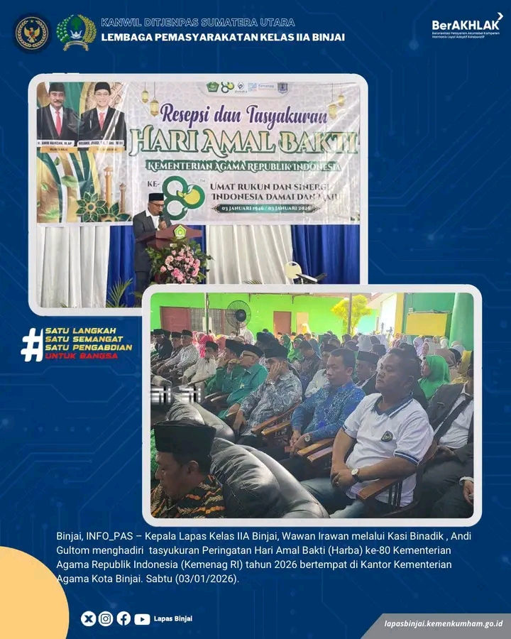 Kepala Lapas Kelas IIA Binjai, Wawan Irawan melalui Kasi Binadik , Andi Gultom menghadiri tasyukuran Peringatan Hari Amal Bakti (Harba) ke-80 Kementerian Agama Republik Indonesia (Kemenag RI) tahun 2026 bertempat di Kantor Kementerian Agama Kota Binjai. Sabtu (03/01/2026).