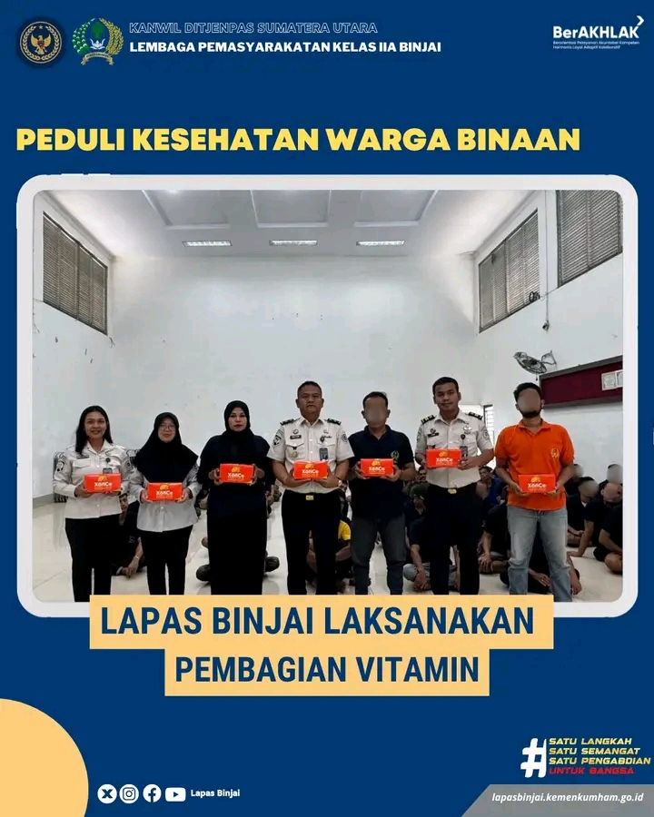 Lembaga Pemasyarakatan (Lapas) Kelas IIA Binjai, melakukan pembagian vitamin kepada warga binaan. Pembagian Ini dibagikan langsung oleh Kasi Binadik, Andi Gultom, bersama dengan Kasubsi Bimkemaswat, Dion Sitorus beserta petugas klinik Lapas kelas IIA Binjai, Senin (19/01/2026).