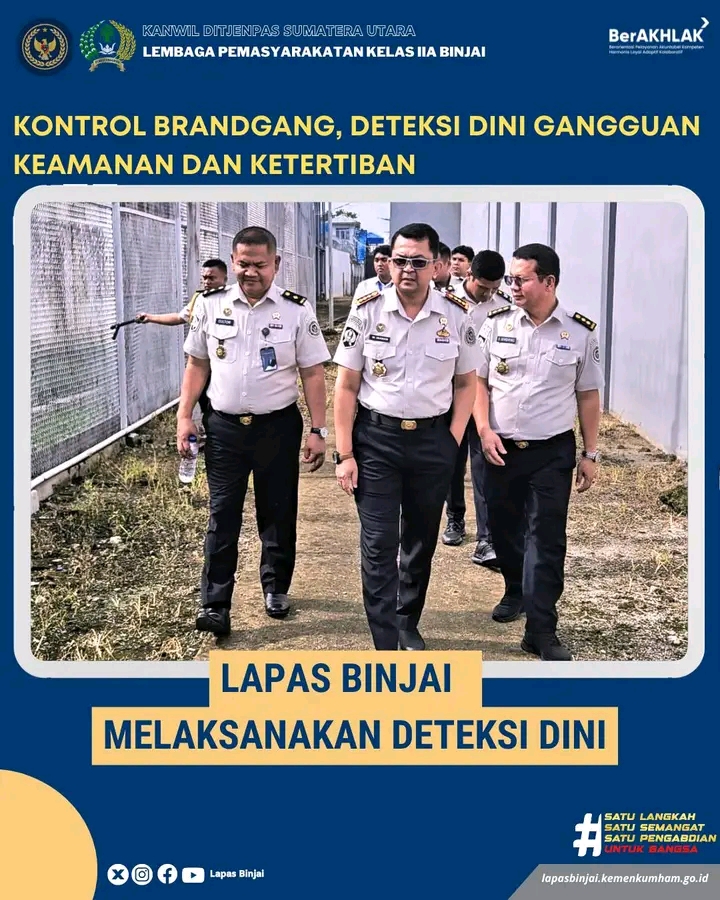 Lembaga Pemasyarakatan Kelas IIA Binjai kembali melaksanakan kegiatan kontrol area brandgang sebagai langkah deteksi dini terhadap potensi gangguan keamanan dan ketertiban. Kegiatan ini dipantau langsung oleh Kalapas, Bapak Wawan Irawan, bersama jajaran struktural dan pengamanan.