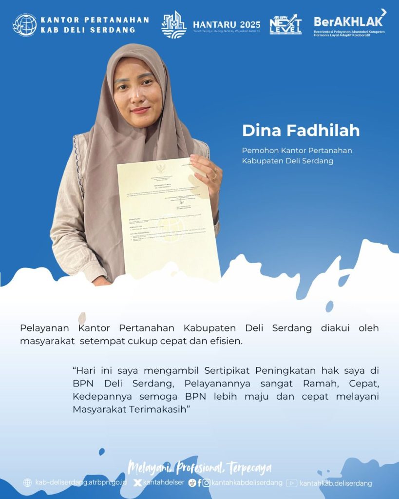 DELI SERDANG, – Upaya peningkatan pelayanan publik yang dilakukan Kantor Pertanahan Kabupaten Deli Serdang kembali menuai apresiasi. Kali ini datang dari Ibu Dina Fadhilah, warga yang baru saja menerima sertipikat tanah hasil permohonan perubahan hak pada Selasa, 21 Oktober 2025.