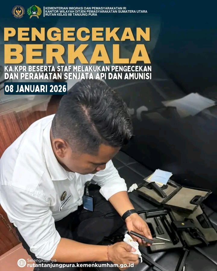 Tanjung Pura, HARIANMEDIARAKYAT – Dalam upaya menjaga keamanan dan ketertiban di lingkungan Rumah Tahanan Negara (Rutan) Tanjung Pura, Kepala Kesatuan Pengamanan Rutan (Ka. KPR) Efriyanto bersama staf melaksanakan kegiatan pengecekan dan perawatan senjata api serta amunisi, Kamis (08/01).