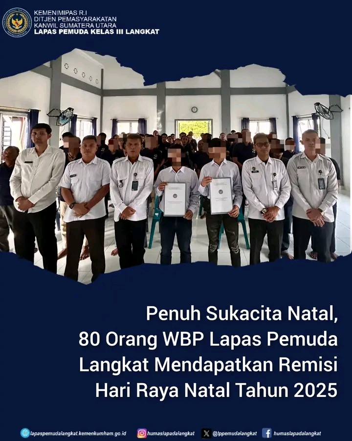 Puluhan Warga Binaan (WBP) Lembaga Pemasyarakatan (Lapas) Pemuda Kelas III Langkat mendapatkan remisi atau pengurangan masa pidana saat Hari Raya Natal 2025, Rabu (25/12/2025). Bertempat di Lapangan Upacara Lapas Pemuda Langkat.