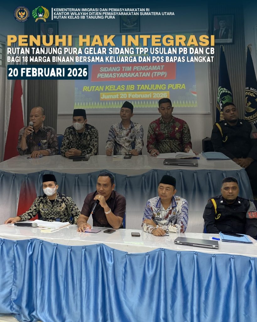 Tanjung Pura, HARIANMEDIARAKYAT – Rumah Tahanan Negara Kelas IIB Tanjung Pura terus berkomitmen memberikan hak-hak warga binaan secara transparan dan akuntabel. Hal ini dibuktikan dengan dilaksanakannya Sidang Tim Pengamat Pemasyarakatan (TPP) terhadap 18 orang Warga Binaan Pemasyarakatan (WBP).