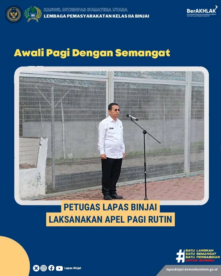 Lembaga Pemasyarakatan (Lapas) Kelas IIA Binjai gelar Apel rutin sebagai kewajiban bagi seluruh pegawai. Bertempat di Halaman Kantor Lapas, apel pagi diikuti mulai dari Pejabat Struktural, Jabatan Fungsional Tertentu (JFT), Jabatan Fungsional Umum (JFU), CPNS Lapas & Peserta Magang dari Kemenaker. Senin, (08/12/2025)