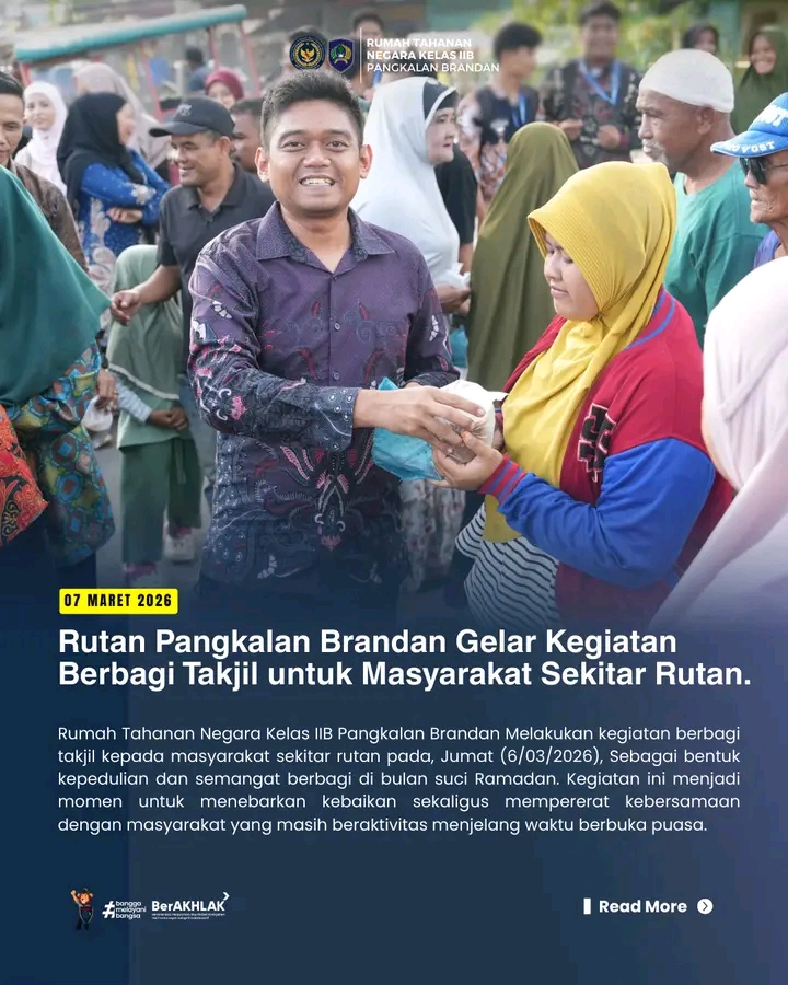Rumah Tahanan Negara Kelas IIB Pangkalan Brandan Melakukan kegiatan berbagi takjil kepada masyarakat sekitar rutan pada, Jumat (6/03/2026), Sebagai bentuk kepedulian dan semangat berbagi di bulan suci Ramadan. Kegiatan ini menjadi momen untuk menebarkan kebaikan sekaligus mempererat kebersamaan dengan masyarakat yang masih beraktivitas menjelang waktu berbuka puasa.