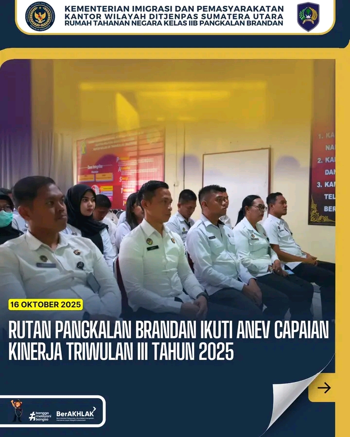 Rumah Tahanan Negara Kelas IIB Pangkalan Brandan mengikuti kegiatan Rapat Analisis dan Evaluasi (Anev) Capaian Kinerja Triwulan III Tahun 2025 yang digelar oleh Kementerian Imigrasi dan Pemasyarakatan (Kemenimpas) pada Kamis, 16 Oktober 2025. Kegiatan yang berlangsung secara hybrid ini diikuti oleh seluruh unit pelaksana teknis (UPT) di lingkungan Kemenimpas.