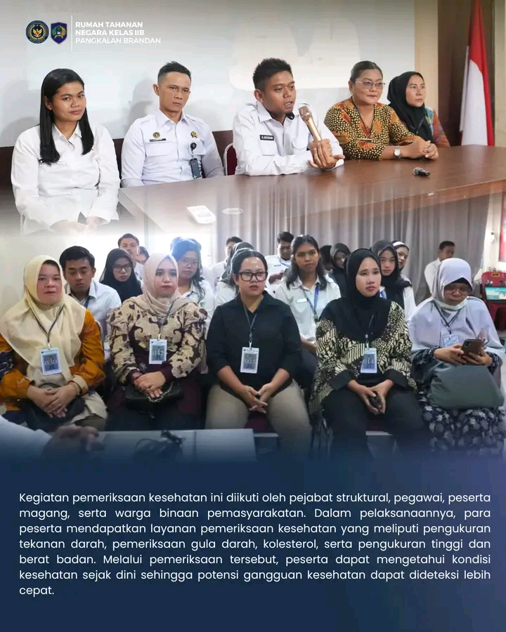 Rumah Tahanan Negara (Rutan) Kelas IIB Pangkalan Brandan mengikuti kegiatan Cek Kesehatan Gratis (CKG) yang dilaksanakan oleh Dinas Kesehatan Kabupaten Langkat melalui UPT Puskesmas Pangkalan Brandan pada Kamis (05/03/2026). Kegiatan ini merupakan tindak lanjut dari kerja sama (MoU) antara Rutan Pangkalan Brandan dan Dinas Kesehatan Kabupaten Langkat dalam rangka meningkatkan pelayanan kesehatan sekaligus melakukan pemantauan kondisi kesehatan di lingkungan rutan.