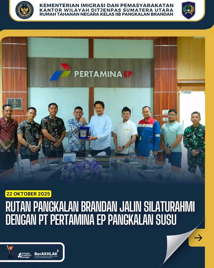 Kepala Rumah Tahanan Negara Kelas IIB Pangkalan Brandan, Akmalun Ikhsan, bersama jajaran menggelar kunjungan silaturahmi ke PT Pertamina EP Pangkalan Susu. Kunjungan ini menjadi ajang mempererat hubungan antara lembaga pemasyarakatan dan dunia industri di wilayah Pangkalan Susu.