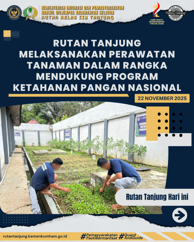 Rumah Tahanan Negara (Rutan) Kelas IIB Tanjung terus berkomitmen mendukung program ketahanan pangan nasional melalui kegiatan perawatan tanaman yang melibatkan warga binaan dengan pengawasan ketat dari petugas. Sabtu (22/11/2025).