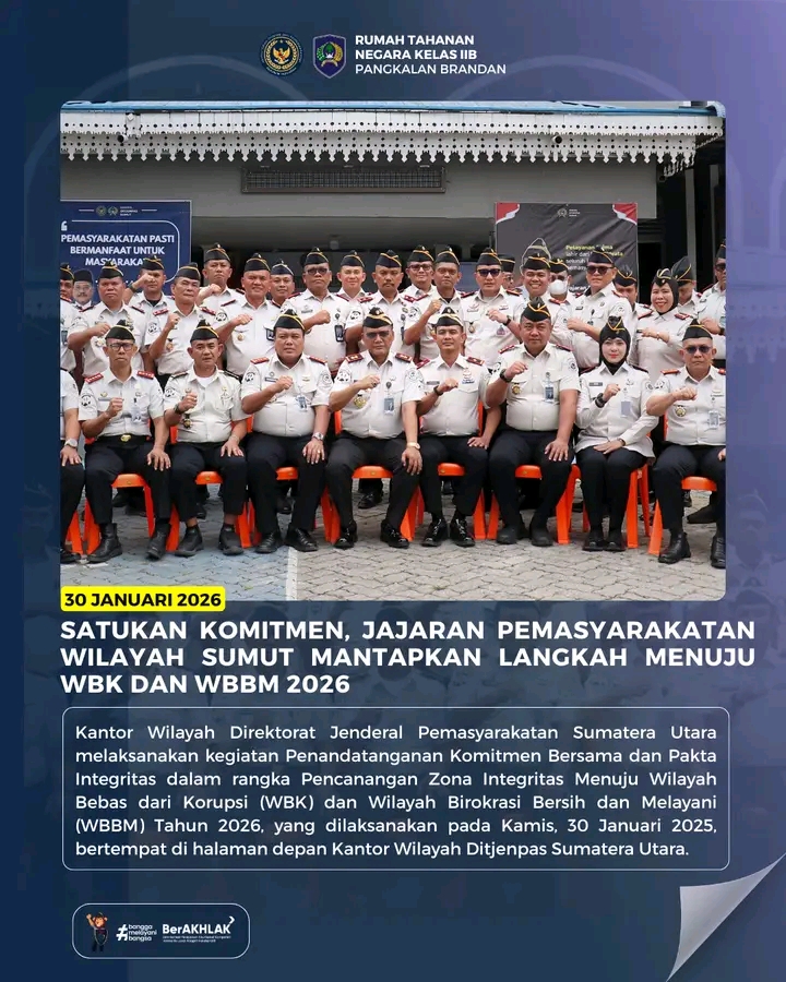 Kantor Wilayah Direktorat Jenderal Pemasyarakatan Sumatera Utara melaksanakan kegiatan Penandatanganan Komitmen Bersama dan Pakta Integritas dalam rangka Pencanangan Zona Integritas Menuju Wilayah Bebas dari Korupsi (WBK) dan Wilayah Birokrasi Bersih dan Melayani (WBBM) Tahun 2026, yang dilaksanakan pada Kamis, 30 Januari 2025, bertempat di halaman depan Kantor Wilayah Ditjenpas Sumatera Utara.