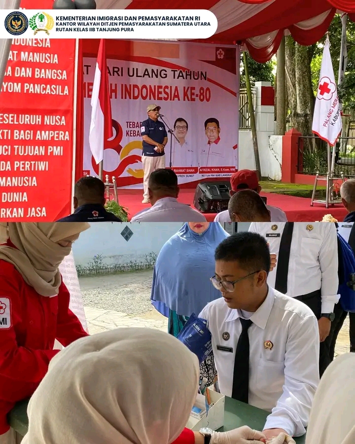 Dalam rangka memperingati Hari Ulang Tahun (HUT) ke-80 Palang Merah Indonesia (PMI) Tahun 2025, Rumah Tahanan Negara Kelas IIB Tanjung Pura ikuti aksi donor darah di halaman Kantor PMI Kabupaten Langkat. Rabu (17/09)