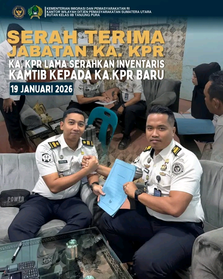 Serah terima dilakukan oleh Ka. KPR lama, Efriyanto kepada Ka. KPR baru, Yoslan Josua Hasurungan Doloksaribu di ruang KA.KPR. Kegiatan serah terima inventaris kamtib dilakukan sebagai bagian dari tata tertib administrasi serta langkah strategis dalam menjamin kesinambungan pelaksanaan tugas pengamanan dan ketertiban di Rutan Tanjung Pura. Proses serah terima dilaksanakan melalui pengecekan fisik secara langsung terhadap seluruh barang inventaris, meliputi kondisi, jumlah, dan kelayakan penggunaan.