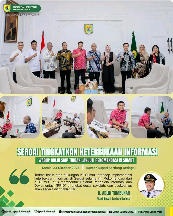 Wakil Bupati Serdang Bedagai (Wabup Sergai) H. Adlin Tambunan, didampingi Sekretaris Daerah Kabupaten (Sekdakab) Suwanto Nasution, S.Pd dan Plt Kadis Komunikasi dan Informatika (Kominfo) Ir. Kamaluddin, M.MA, menerima kunjungan jajaran Komisi Informasi (KI) Provinsi Sumatera Utara (Sumut) dalam rangka visitasi monitoring dan evaluasi Keterbukaan Informasi Publik Tahun 2025. Pertemuan ini berlangsung di Ruang Audensi Wabup di Kompleks Kantor Bupati Sergai di Sei Rampah, Kamis (23/10/2025).