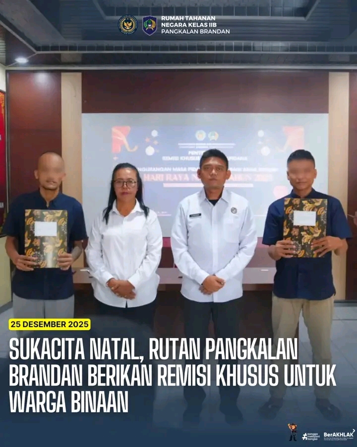 Rumah Tahanan Negara Kelas IIB Pangkalan Brandan memberikan remisi khusus Natal kepada 26 warga binaan beragama Nasrani dalam rangka perayaan Hari Natal dan Tahun Baru 2026. Pemberian remisi ini menjadi bagian dari pemenuhan hak warga binaan sekaligus momentum pembinaan yang menekankan nilai kemanusiaan.