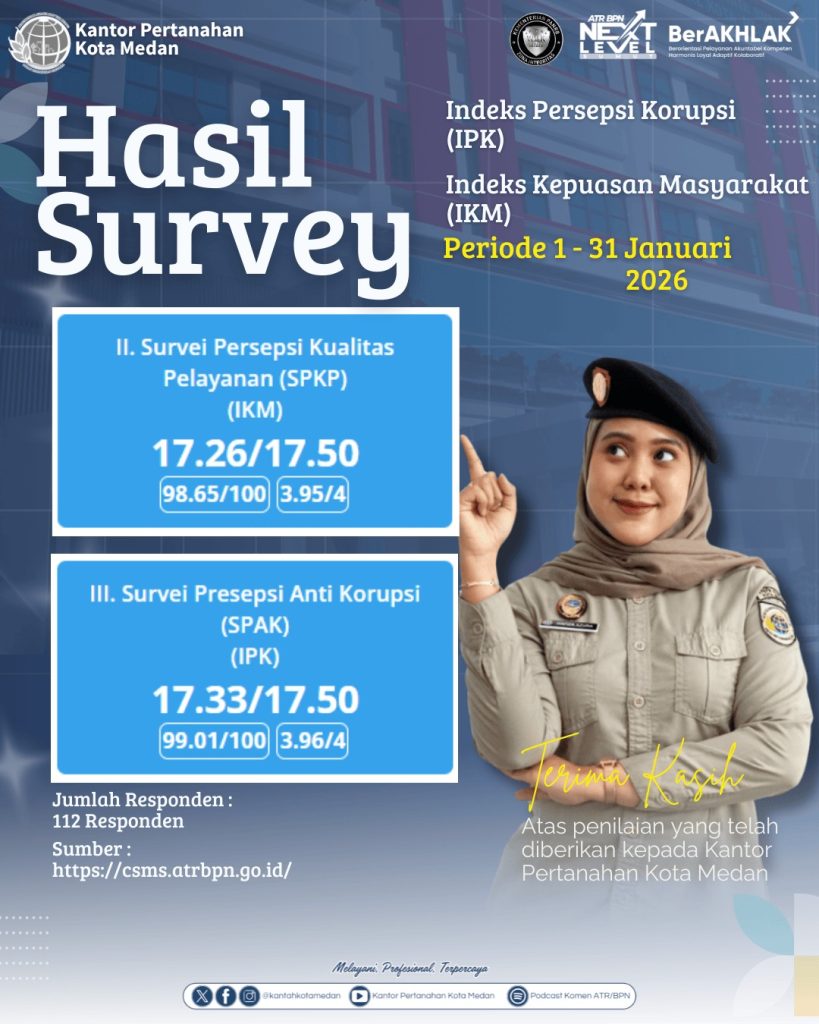 Survei ini melibatkan para pemohon layanan pertanahan yang telah merasakan langsung proses administrasi di Kantor Pertanahan Kota Medan. Penilaian mencakup berbagai aspek, mulai dari kemudahan prosedur, kecepatan layanan, kompetensi petugas, hingga sarana dan prasarana pendukung. Hasil yang diraih mencerminkan tingkat kepercayaan dan kepuasan masyarakat terhadap kinerja jajaran kantor pertanahan.