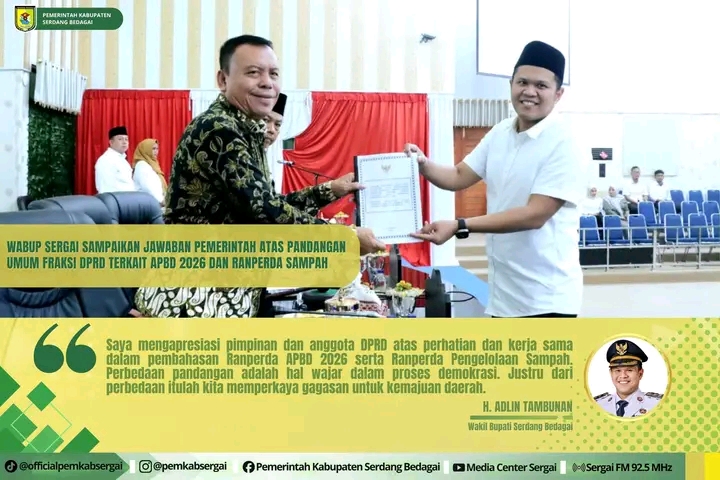 Pemerintah Kabupaten Serdang Bedagai (Pemkab Sergai) menyampaikan jawaban atas pandangan umum fraksi-fraksi DPRD terkait Nota Pengantar Rancangan Peraturan Daerah (Ranperda) tentang APBD Tahun Anggaran 2026 serta pendapat terhadap Ranperda inisiatif DPRD tentang Pengelolaan Sampah. Jawaban tersebut disampaikan oleh Wakil Bupati (Wabup) Sergai H. Adlin Tambunan dalam rapat paripurna DPRD yang digelar di Ruang Rapat Paripurna DPRD Sergai, Sei Rampah, Rabu (22/10/2025).